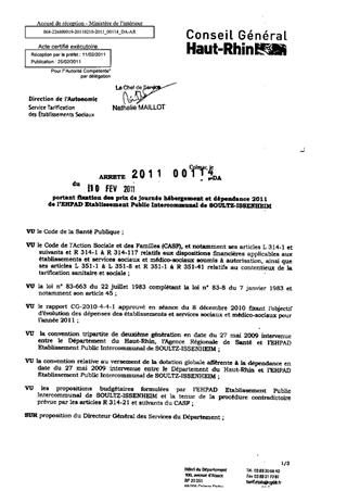 portant fixation des prix de journée hébergement et dépendance 2011 de l'EHPAD Etablissement Public Intercommunalde SOULTZ-ISSENHEIM. Resumé Pièces jointes ARRETE Assemblée : Non défini Date : 10/02/2011 Rapporteur : Non défini Collectivité : Conseil départemental du Haut-Rhin Direction : Non défini Service : Direction de l'Autonomie Domaine : Prix de Journée Commission :