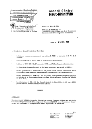 portant nomination du Président Délégué au sein de la Commission Départementale d'Aménagement Commercial. Resumé Pièces jointes ARRETE Assemblée : Non défini Date : 15/02/2011 Rapporteur : Non défini Collectivité : Conseil départemental du Haut-Rhin Direction : Non défini Service : Service Développement Economique Domaine : Autres (non classés) Commission :