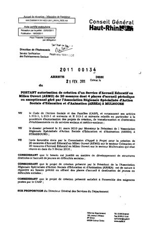 portant autorisation de création d'un service d'accueil éducatif en milieu ouvert (AEMO) de 20 mesures dont 4 places d'accueil périodique ou exceptionnel géré par l'association régionale spécialisée d'action sociale d'éducation et d'animation (ARSEA) à MU