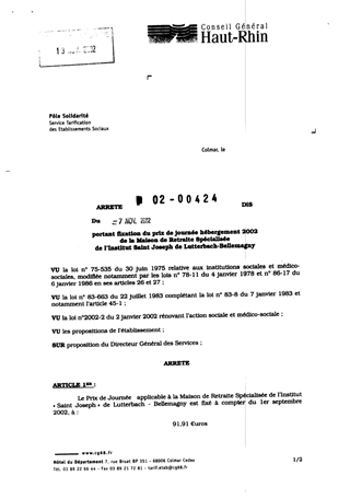 portant fixation du prix de journée hébergement 2002 de la Maison de Retraite Spécialisée de l'Institut St Joseph de LUTTERBACH-BELLEMAGNY. Resumé Pièces jointes ARRETE Assemblée : Non défini Date : 07/11/2002 Rapporteur : Non défini Collectivité : Conseil départemental du Haut-Rhin Direction : Non défini Service : Direction de la Solidarité Domaine : Prix de Journée Commission :