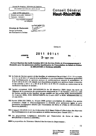 portant fixation des tarifs horaires 2011 du service d'aide et d'accompagnement à domicile pour les personnes adultes handicapées de l'association de soins et d'aides de MULHOUSE et Environs (ASAME). Resumé Pièces jointes ARRETE Assemblée : Non défini Date : 02/03/2011 Rapporteur : Non défini Collectivité : Conseil départemental du Haut-Rhin Direction : Non défini Service : Direction de l'Autonomie Domaine : Autres (non classés) Commission :