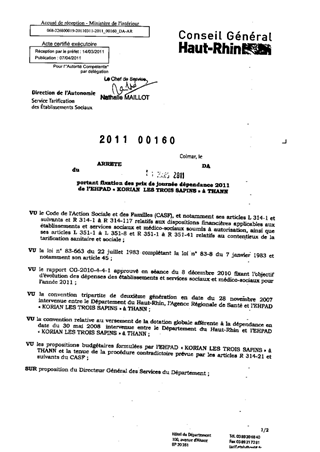 portant fixation des prix de journée dépendance 2011 de l'EHPAD "Korian Les Trois Sapins" à THANN. Resumé Pièces jointes ARRETE Assemblée : Non défini Date : 11/03/2011 Rapporteur : Non défini Collectivité : Conseil départemental du Haut-Rhin Direction : Non défini Service : Direction de l'Autonomie Domaine : Prix de Journée Commission :