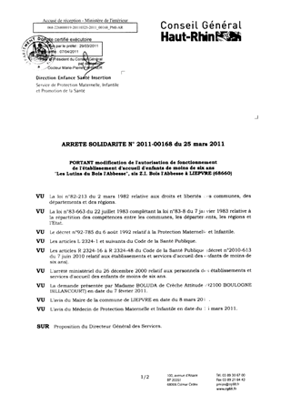 portant modification de l'autorisation de fonctionnement de l'établissement d'accueil d'enfants de moins de six ans "Les Lutins du Bois d'Abbesse", sis Z.I. Bois l'Abbesse à LIEPVRE (68660). Resumé Pièces jointes ARRETE Assemblée : Non défini Date : 25/03/2011 Rapporteur : Non défini Collectivité : Conseil départemental du Haut-Rhin Direction : Non défini Service : Direction Enfance Santé Insertion Domaine : Accueil d'enfants Commission :