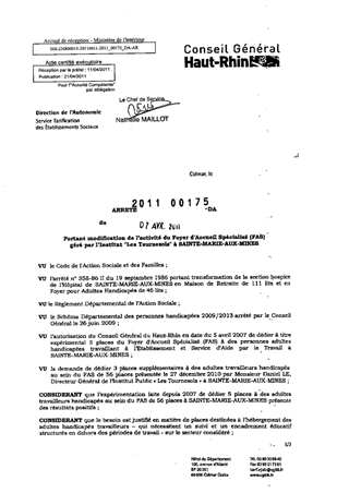 portant modification de l'activité du foyer d'accueil spécialisé (FAS) géré par l'Institut "Les Tournesols" à SAINTE-MARIE-AUX-MINES. Resumé Pièces jointes ARRETE Assemblée : Non défini Date : 07/04/2011 Rapporteur : Non défini Collectivité : Conseil départemental du Haut-Rhin Direction : Non défini Service : Direction de l'Autonomie Domaine : Autres (non classés) Commission :