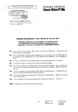 portant modification de l'autorisation de fonctionnement de l'établissement d'accueil d'enfants de moins de six ans "L'Eglantine", sis au 20 rue du Beau Site à RIEDISHEIM (68400). Resumé Pièces jointes ARRETE Assemblée : Non défini Date : 18/04/2011 Rapporteur : Non défini Collectivité : Conseil départemental du Haut-Rhin Direction : Non défini Service : Direction Enfance Santé Insertion Domaine : Accueil d'enfants Commission :
