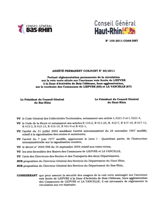portant réglementation permanente de la circulation sur la voie verte située sur l'ancienne voie ferrée de LIEPVRE à la zone d'activités de Bois l'Abbesse, hors agglomération, sur le territoire des communes de LIEPVRE (68) et LA VANCELLE (67). Resumé Pièces jointes ARRETE Assemblée : Non défini Date : 20/04/2011 Rapporteur : Non défini Collectivité : Conseil départemental du Haut-Rhin Direction : Non défini Service : Direction des Routes Domaine : Circulation Commission :