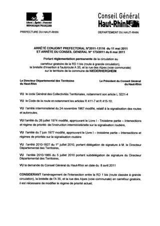portant réglementation permanente de la circulation au carrefour giratoirede la RD 1 bis (route à grande circulation), la bretelle d'insertion à l'autoroute A35, et la rue des Alpes (voie communale) sur le territoire de la commune de NIEDERHERGHEIM. Resumé Pièces jointes ARRETE Assemblée : Non défini Date : 11/05/2011 Rapporteur : Non défini Collectivité : Conseil départemental du Haut-Rhin Direction : Non défini Service : Direction des Routes Domaine : Circulation Commission :