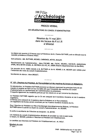 Procès-verbal des délibérations du Conseil d'Administration de la réunion du 11 mai 2011 dans les locaux du PAIR à SELESTAT. Resumé Pièces jointes ARRETE Assemblée : Non défini Date : 11/05/2011 Rapporteur : Non défini Collectivité : Conseil départemental du Haut-Rhin Direction : Non défini Service : Direction de la Culture et du Patrimoine Domaine : Autres (non classés) Commission :