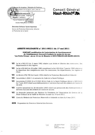 portant modification de l'autorisation de fonctionnement de l'établissement d'accueil d'enfants de moins de six ans "Les Petits Petons", sis au 16 rue de Munster à SOULTZBACH LES BAINS (68230). Resumé Pièces jointes ARRETE Assemblée : Non défini Date : 17/05/2011 Rapporteur : Non défini Collectivité : Conseil départemental du Haut-Rhin Direction : Non défini Service : Direction Enfance Santé Insertion Domaine : Accueil d'enfants Commission :