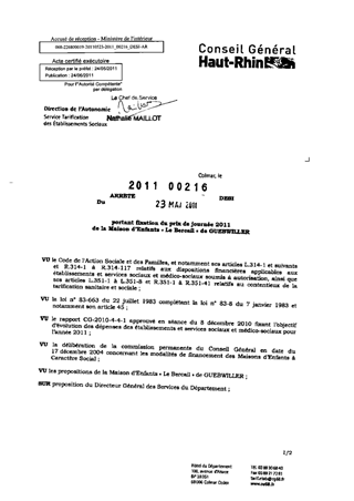 portant fixation du prix de journée 2011 de la Maison d'Enfants "Le Bercail" de GUEBWILLER. Resumé Pièces jointes ARRETE Assemblée : Non défini Date : 23/05/2011 Rapporteur : Non défini Collectivité : Conseil départemental du Haut-Rhin Direction : Non défini Service : Direction de l'Autonomie Domaine : Prix de Journée Commission :