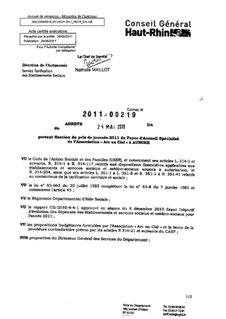 portant fixation des prix de journée 2011 du foyer d'accueil spécialisé de l'association "Arc en Ciel" à AUBURE. Resumé Pièces jointes ARRETE Assemblée : Non défini Date : 24/05/2011 Rapporteur : Non défini Collectivité : Conseil départemental du Haut-Rhin Direction : Non défini Service : Direction de l'Autonomie Domaine : Prix de Journée Commission :