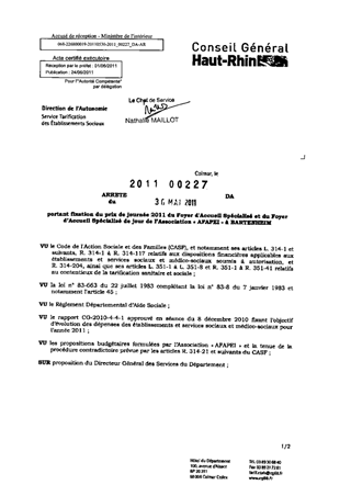 portant fixation du prix de journée 2011 du foyer d'accueil spécialisé et du foyer d'accueil spécialisé de jour de l'association "AFAPEI" à BARTENHEIM. Resumé Pièces jointes ARRETE Assemblée : Non défini Date : 30/05/2011 Rapporteur : Non défini Collectivité : Conseil départemental du Haut-Rhin Direction : Non défini Service : Direction de l'Autonomie Domaine : Prix de Journée Commission :