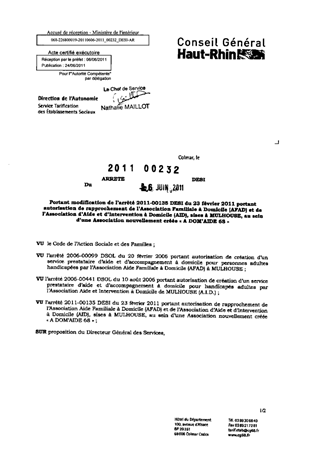 portant modification de l'arrêté 2011-00135-DESI du 23.02.2011 portant autorisation de rapprochement del'association familiale à domicile (AFAD) et de l'association d'aide et d'intervention à domicile (AID), sises à MULHOUSE, au sein d'une association ...