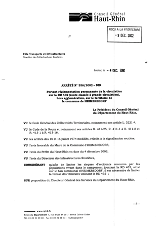 portant réglementation permanente de la circulation sur la RD 432 (route classée à grande circulation), hors agglomération, sur le territoire de la commune de HEIMERSDORF. Resumé Pièces jointes ARRETE Assemblée : Non défini Date : 04/12/2002 Rapporteur : Non défini Collectivité : Conseil départemental du Haut-Rhin Direction : Non défini Service : Direction des Routes Domaine : Circulation Commission :