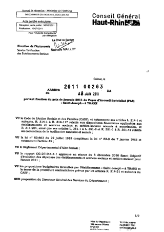 portant fixation du prix de journée 2011 du du foyer d'accueil spécialisé (FAS) "Saint-Joseph" à THANN. Resumé Pièces jointes ARRETE Assemblée : Non défini Date : 28/06/2011 Rapporteur : Non défini Collectivité : Conseil départemental du Haut-Rhin Direction : Non défini Service : Direction de l'Autonomie Domaine : Prix de Journée Commission :