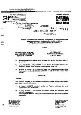 portant nomination des membres permanents de la commission de sélection d'appel à projet médico-social conjointe "ARS Alsace/Conseil Général du Haut-Rhin". Resumé Pièces jointes ARRETE Assemblée : Non défini Date : 29/06/2011 Rapporteur : Non défini Collectivité : Conseil départemental du Haut-Rhin Direction : Non défini Service : Direction Développement Social des Territoires Domaine : Autres (non classés) Commission :