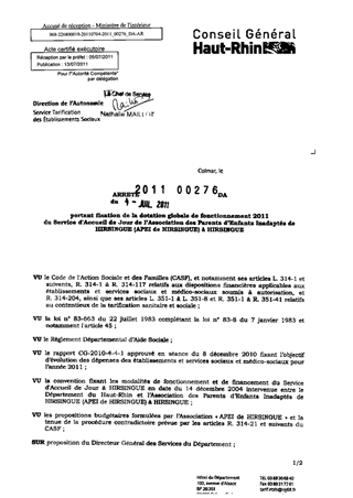 portant fixation de la dotation globale de fonctionnement 2011 du service d'accueil de jour de l'association des parents d'enfants inadaptés de HIRSINGUE (APEI de HIRSINGUE° à HIRSINGUE. Resumé Pièces jointes ARRETE Assemblée : Non défini Date : 04/07/2011 Rapporteur : Non défini Collectivité : Conseil départemental du Haut-Rhin Direction : Non défini Service : Direction de l'Autonomie Domaine : Dotations financières Commission :
