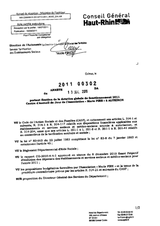 portant fixation de la dotation globale de fonctionnement 2011 centre d'accueil de jour de l'association "Marie PIRE" à ALTKIRCH. Resumé Pièces jointes ARRETE Assemblée : Non défini Date : 13/07/2011 Rapporteur : Non défini Collectivité : Conseil départemental du Haut-Rhin Direction : Non défini Service : Direction de l'Autonomie Domaine : Dotations financières Commission :