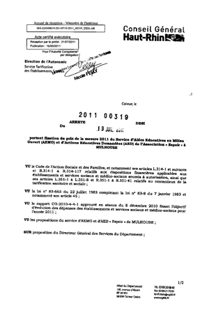 portant fixation du prix de la mesure 2011 du service d'aides éducatives en milieu ouvert (AEMO) et d'actions éducatives demandées (AED) de l'association "Espoir" à MULHOUSE. Resumé Pièces jointes ARRETE Assemblée : Non défini Date : 19/07/2011 Rapporteur : Non défini Collectivité : Conseil départemental du Haut-Rhin Direction : Non défini Service : Direction de l'Autonomie Domaine : Autres (non classés) Commission :