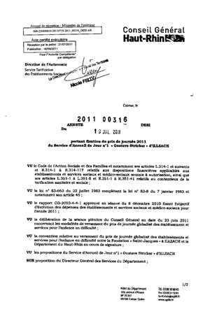 portant fixation du prix de journée 2011 du service d'accueil de jour n° 1 "Gustave Stricker" d'ILLZACH. Resumé Pièces jointes ARRETE Assemblée : Non défini Date : 19/07/2011 Rapporteur : Non défini Collectivité : Conseil départemental du Haut-Rhin Direction : Non défini Service : Direction de l'Autonomie Domaine : Prix de Journée Commission :