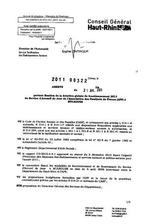 portant fixation de la dotation globale de fonctionnement 2011 du service d'accueil de jour de l'Association des Paralysés de France (APF) à MULHOUSE. Resumé Pièces jointes ARRETE Assemblée : Non défini Date : 21/07/2011 Rapporteur : Non défini Collectivité : Conseil départemental du Haut-Rhin Direction : Non défini Service : Direction de l'Autonomie Domaine : Dotations financières Commission :