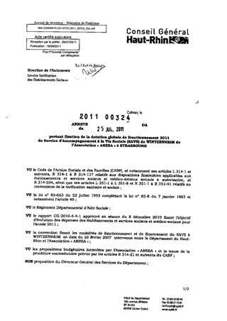 portant fixation de la dotation globale de fonctionnement 2011 du service d'accompagnement à la vie sociale (SAVS) de WINTZENHEIM de l'Association "ARSEA" à STRASBOURG. Resumé Pièces jointes ARRETE Assemblée : Non défini Date : 25/07/2011 Rapporteur : Non défini Collectivité : Conseil départemental du Haut-Rhin Direction : Non défini Service : Direction de l'Autonomie Domaine : Dotations financières Commission :