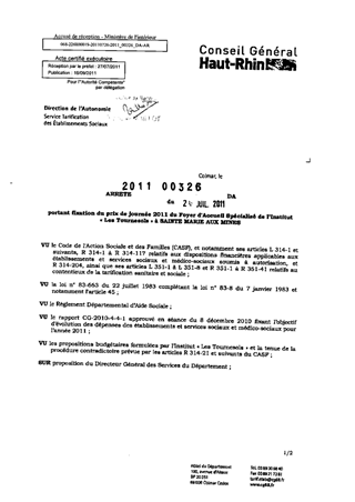 portant fixation du prix de journée 2011 du foyer d'accueil spécialisé de l'Institut "Les Tournesols" à SAINTE MARIE AUX MINES. Resumé Pièces jointes ARRETE Assemblée : Non défini Date : 26/07/2011 Rapporteur : Non défini Collectivité : Conseil départemental du Haut-Rhin Direction : Non défini Service : Direction de l'Autonomie Domaine : Prix de Journée Commission :