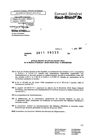 portant fixation du prix de journée 2011 de la Maison d'enfants "Home Saint-Jean" à MULHOUSE. Resumé Pièces jointes ARRETE Assemblée : Non défini Date : 16/08/2011 Rapporteur : Non défini Collectivité : Conseil départemental du Haut-Rhin Direction : Non défini Service : Direction de l'Autonomie Domaine : Prix de Journée Commission :