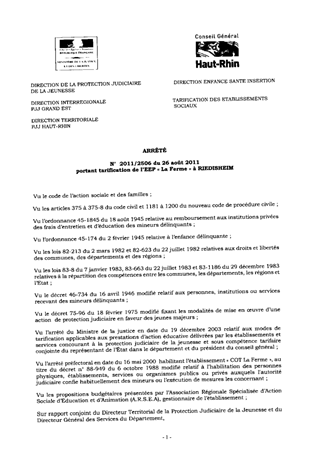 portant tarification de l'EEP "La Ferme" à RIEDISHEIM. Resumé Pièces jointes ARRETE Assemblée : Non défini Date : 26/08/2011 Rapporteur : Non défini Collectivité : Conseil départemental du Haut-Rhin Direction : Non défini Service : Direction Enfance Santé Insertion Domaine : Autres (non classés) Commission :