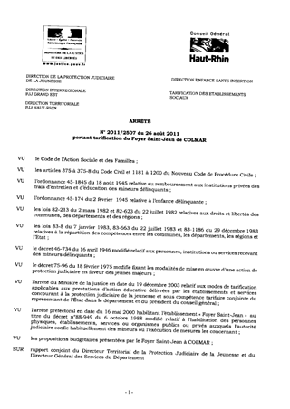 portant tarification du foyer Saint-Jean de COLMAR. Resumé Pièces jointes ARRETE Assemblée : Non défini Date : 26/08/2011 Rapporteur : Non défini Collectivité : Conseil départemental du Haut-Rhin Direction : Non défini Service : Direction Enfance Santé Insertion Domaine : Autres (non classés) Commission :