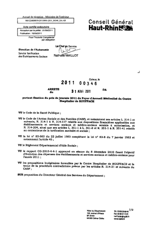 portant fixation du prix de journée 2011 du foyer d'accueil médicalisé du centre hospitalier de ROUFFACH. Resumé Pièces jointes ARRETE Assemblée : Non défini Date : 31/08/2011 Rapporteur : Non défini Collectivité : Conseil départemental du Haut-Rhin Direction : Non défini Service : Direction de l'Autonomie Domaine : Prix de Journée Commission :