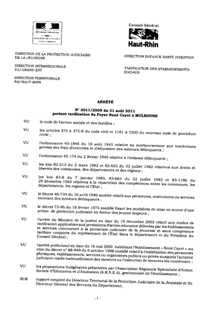 portant tarification du foyer René Cayet à MULHOUSE. Resumé Pièces jointes ARRETE Assemblée : Non défini Date : 31/08/2011 Rapporteur : Non défini Collectivité : Conseil départemental du Haut-Rhin Direction : Non défini Service : Direction Enfance Santé Insertion Domaine : Autres (non classés) Commission :