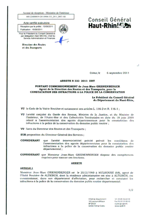 portant commissionnement de Jean-Marc GRIENENBERGER agent de la Direction des Routes et des Transports, pour la constatation des infractions à la police de la conservation. Resumé Pièces jointes ARRETE Assemblée : Non défini Date : 06/09/2011 Rapporteur : Non défini Collectivité : Conseil départemental du Haut-Rhin Direction : Non défini Service : Direction des Routes Domaine : Autres (non classés) Commission :