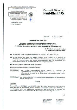portant commissionnement de Florence HIRTZLIN agent de la Direction des Routes et des Transports, pour la constatation des infractions à la police de la conservation. Resumé Pièces jointes ARRETE Assemblée : Non défini Date : 06/09/2011 Rapporteur : Non défini Collectivité : Conseil départemental du Haut-Rhin Direction : Non défini Service : Direction des Routes Domaine : Autres (non classés) Commission :