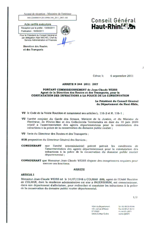 portant commissionnement de Jean-Claude WEISS agent de la Direction des Routes et des Transports, pour la constatation des infractions à la police de la conservation. Resumé Pièces jointes ARRETE Assemblée : Non défini Date : 06/09/2011 Rapporteur : Non défini Collectivité : Conseil départemental du Haut-Rhin Direction : Non défini Service : Direction des Routes Domaine : Autres (non classés) Commission :