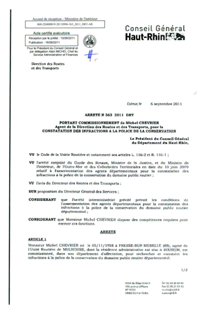 portant commissionnement de Michel CHEVRIER agent de la Direction des Routes et des Transports, pour la constatation des infractions à la police de la conservation. Resumé Pièces jointes ARRETE Assemblée : Non défini Date : 06/09/2011 Rapporteur : Non défini Collectivité : Conseil départemental du Haut-Rhin Direction : Non défini Service : Direction des Routes Domaine : Autres (non classés) Commission :
