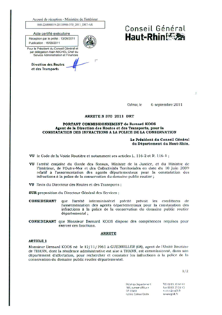 portant commissionnement de Bernard KOOS agent de la Direction des Routes et des Transports, pour la constatation des infractions à la police de la conservation. Resumé Pièces jointes ARRETE Assemblée : Non défini Date : 06/09/2011 Rapporteur : Non défini Collectivité : Conseil départemental du Haut-Rhin Direction : Non défini Service : Direction des Routes Domaine : Autres (non classés) Commission :