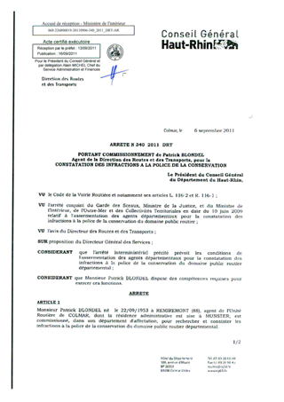 portant commissionnement de Patrick BLONDEL agent de la Direction des Routes et des Transports, pour la constatation des infractions à la police de la conservation. Resumé Pièces jointes ARRETE Assemblée : Non défini Date : 06/09/2011 Rapporteur : Non défini Collectivité : Conseil départemental du Haut-Rhin Direction : Non défini Service : Direction des Routes Domaine : Autres (non classés) Commission :