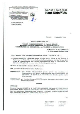 portant commissionnement de François MULLER agent de la Direction des Routes et des Transports, pour la constatation des infractions à la police de la conservation. Resumé Pièces jointes ARRETE Assemblée : Non défini Date : 06/09/2011 Rapporteur : Non défini Collectivité : Conseil départemental du Haut-Rhin Direction : Non défini Service : Direction des Routes Domaine : Autres (non classés) Commission :