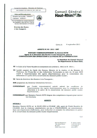 portant commissionnement de Patrick ROTH agent de la Direction des Routes et des Transports, pour la constatation des infractions à la police de la conservation. Resumé Pièces jointes ARRETE Assemblée : Non défini Date : 06/09/2011 Rapporteur : Non défini Collectivité : Conseil départemental du Haut-Rhin Direction : Non défini Service : Direction des Routes Domaine : Autres (non classés) Commission :