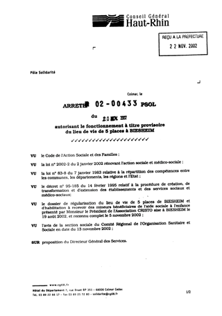 autorisant le fonctionnement à titre provisoire du lieu de vie de 5 places à BIESHEIM. Resumé Pièces jointes ARRETE Assemblée : Non défini Date : 14/01/2003 Rapporteur : Non défini Collectivité : Conseil départemental du Haut-Rhin Direction : Non défini Service : Direction de la Solidarité Domaine : Autres (non classés) Commission :