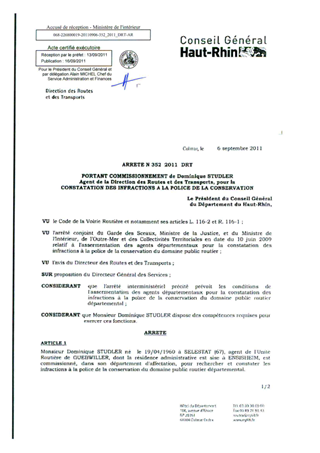 portant commissionnement de Dominique STUDLER agent de la Direction des Routes et des Transports, pour la constatation des infractions à la police de la conservation. Resumé Pièces jointes ARRETE Assemblée : Non défini Date : 06/09/2011 Rapporteur : Non défini Collectivité : Conseil départemental du Haut-Rhin Direction : Non défini Service : Direction des Routes Domaine : Autres (non classés) Commission :