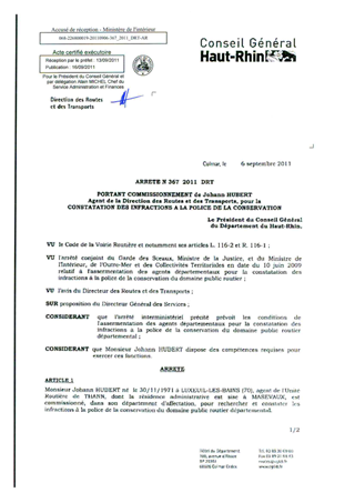 portant commissionnement de Johann HUBERT agent de la Direction des Routes et des Transports, pour la constatation des infractions à la police de la conservation. Resumé Pièces jointes ARRETE Assemblée : Non défini Date : 06/09/2011 Rapporteur : Non défini Collectivité : Conseil départemental du Haut-Rhin Direction : Non défini Service : Direction des Routes Domaine : Autres (non classés) Commission :