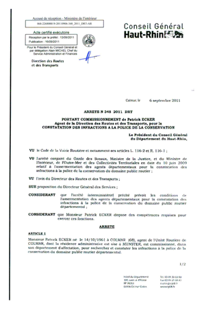 portant commissionnement de Patrick ECKER agent de la Direction des Routes et des Transports, pour la constatation des infractions à la police de la conservation. Resumé Pièces jointes ARRETE Assemblée : Non défini Date : 06/09/2011 Rapporteur : Non défini Collectivité : Conseil départemental du Haut-Rhin Direction : Non défini Service : Direction des Routes Domaine : Autres (non classés) Commission :