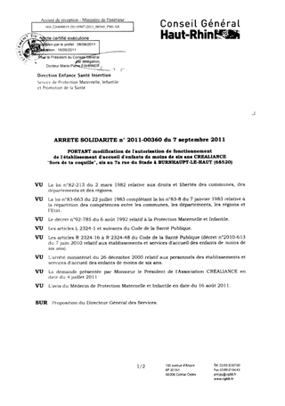 portant modification de l'autorisation de fonctionnement de l'établissement d'accueil d'enfants de moins de six ans CREALLIANCE "Sors de ta coquille", sis au 7a rue du Stade à BURNHAUPT LE HAUT (68520). Resumé Pièces jointes ARRETE Assemblée : Non défini Date : 07/09/2011 Rapporteur : Non défini Collectivité : Conseil départemental du Haut-Rhin Direction : Non défini Service : Direction Enfance Santé Insertion Domaine : Accueil d'enfants Commission :