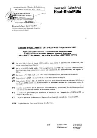 portant modification de l'autorisation de fonctionnement de l'établissement d'accueil d'enfants de moins de six ans "Créalliance "La Ribandoll"", sis au 27a Grand'Rue à SENTHEIM (68780). Resumé Pièces jointes ARRETE Assemblée : Non défini Date : 07/09/2011 Rapporteur : Non défini Collectivité : Conseil départemental du Haut-Rhin Direction : Non défini Service : Direction Enfance Santé Insertion Domaine : Accueil d'enfants Commission :