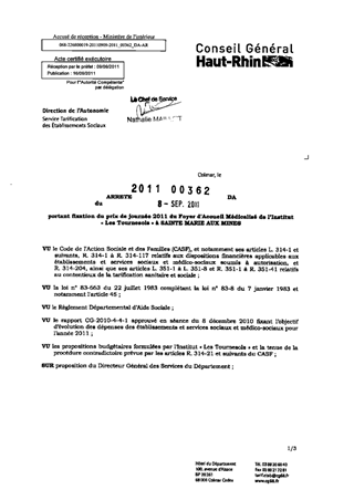 portant fixation du prix de journée 2011 du foyer d'accueil médicalisé de l'Institut "Les Tournesols" à SAINTE MARIE AUX MINES. Resumé Pièces jointes ARRETE Assemblée : Non défini Date : 08/09/2011 Rapporteur : Non défini Collectivité : Conseil départemental du Haut-Rhin Direction : Non défini Service : Direction de l'Autonomie Domaine : Prix de Journée Commission :