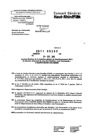 portant fixation de la dotation globale de fonctionnement 2011 du service d'accueil de jour de l'Institut "Les Tournesols" à SAINTE MARIE AUX MINES. Resumé Pièces jointes ARRETE Assemblée : Non défini Date : 08/09/2011 Rapporteur : Non défini Collectivité : Conseil départemental du Haut-Rhin Direction : Non défini Service : Direction de l'Autonomie Domaine : Dotations financières Commission :
