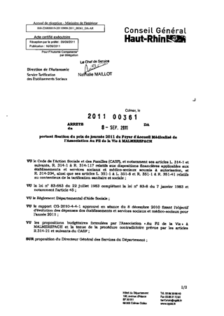 portant fixation du prix de journée 2011 du foyer d'accueil médicalisé de l'Association "Au Fil de la Vie" à MALMERSPACH. Resumé Pièces jointes ARRETE Assemblée : Non défini Date : 08/09/2011 Rapporteur : Non défini Collectivité : Conseil départemental du Haut-Rhin Direction : Non défini Service : Direction de l'Autonomie Domaine : Prix de Journée Commission :