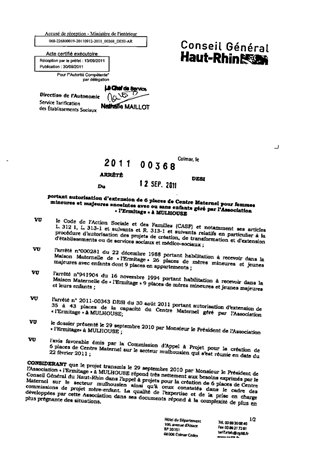 portant autorisation d'extension de 6 places de centre maternel pour femmes mineures et majeures enceintes avec ou sans enfants géré par l'Association "L'Ermitage" à MULHOUSE. Resumé Pièces jointes ARRETE Assemblée : Non défini Date : 12/09/2011 Rapporteur : Non défini Collectivité : Conseil départemental du Haut-Rhin Direction : Non défini Service : Direction de l'Autonomie Domaine : Autres (non classés) Commission :